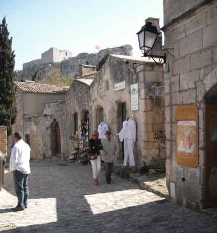 La rue des Fours, aux Baux-de-Provence, est une des plus anciennes rues du village. Elle doit son nom aux deux bâtiments pointus situés sur la droite de la photographie et qui avaient fonction de fours à pains. Aujourd’hui reconverti en boutique, le lieu a gardé sa forme ancienne et on retrouve dans cette rue désormais parfaitement pavée le souvenir de ses anciens habitants.On notera aussi la belle vue sur le château, en arrière-plan, aujourd’hui comme hier.
