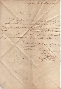 La lettre que nous considérons aujourd’hui est un document écrit le 3 mars 1858. Il s’agit d’une lettre à la pliure audacieuse dont l’expéditeur, Louis Calvet d’Avignon, accuse réception d’un mandat émis par M. Regne (faut-il lire Reyne, un patronyme présent dans la région de Céreste ?), un marchand de bois de Céreste (Alpes-de-Haute-Provence).