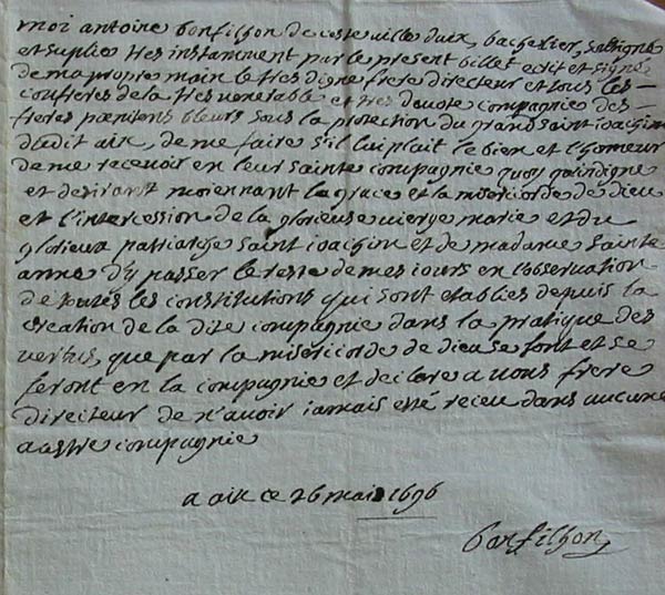 « moi antoine bonfilhon de ceste ville d’aix, bachelier, soussigné, et suplie très instamment par le présent billet ecrit et signé de ma propre main le très digne frer direteur et tous les confreres de la tres venerable et tres devote compagnie des freres pænitens bleurs sous la protection du grand saint ioachim dudit aix, de me faire s’il lui plait le bien et l’honneur de me recevoir en leur sainte compagnie quoy qu’indigne et desirant moiennant la grace et la misericorde de dieu et l’intercession de la glorieuse vierge marie et du glorieux patriarche saint ioachim et de madame sainte anne d’y passer le reste de mes iours en l’observation de toutes les institutions qui sont etablies depuis la creation de la dite compagnie dans la pratique des vertus, que par la misericorde de dieu se font et se feront en la compagnie et declare a vous frere directeur de n’avoir iamais esté receu dans aucune austre compagnie.