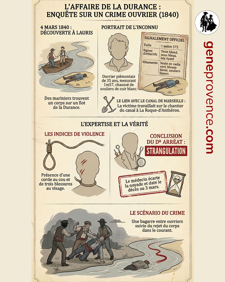 On parvint également à identifier le cadavre, semble-t-il pas à lui donner un nom, mais du moins à préciser que l’individu était un Piémontais qui travaillait au canal de Marseille, sur la commune de La Roque-d’Anthéron (Bouches-du-Rhône). On pensait qu’il avait été la victime d’une bagarre entre ouvriers du canal et que, tué à La Roque, son corps avait été jeté à l’eau et avait voyagé jusqu’à la commune voisine de Lauris.