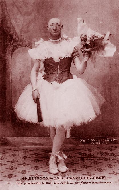crun-crun-01On l’appelait Crun-Crun et le considérait comme un innocent. Dans n’importe quel village, il aurait été l’incontournable et parfait idiot. Mais il ne vécut qu’à Avignon où il apparut vers 1900 et il y eut une certaine notoriété. Comme il jouait d’un violon qui n’avait qu’une corde avec une fourchette édentée, le son qu’il réussissait à extraire de ce crin-crin lui valut son surnom.