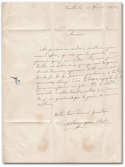 Une lettre, écrite le jeudi 10 février 1853 et expédiée le samedi 12, et dont l’adresse indique :