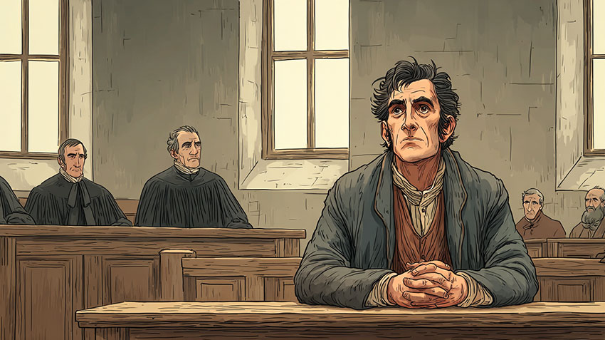 Un homme, vêtu de haillons, s’asseyait le 19 mars 1840 sur le banc des prévenus, comme coupable du délit de rupture de ban, au tribunal de police correctionnelle d’Aix-en-Provence. Il s’exprimait avec aisance, mais surtout sa voix laissait entendre le son de la vérité. Voici le dialogue qu’il eut avec le président, à peine modifié pour le rendre plus compréhensible mais en en respectant en tout point le sens :