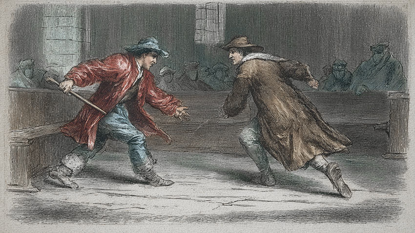 « L’an que dessus [1694] et le 7 décembre, le sieur Joseph Fresquière a fait réparation publiquement à Dieu et à l’Église, devant l’autel de Notre-Seigneur, de l’irrévérence et du scandale qu’il avait fait dans cette église en donnant quelques coups de bâton à Barthélemy Bouisson, l’enterre-mort,