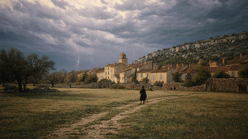 L’orage grondait sur les sommets lorsque la foudre s’abattit brutalement sur un rocher imposant qui dominait le village. Sous l’impact électrique, la masse de pierre se fendit et fut fortement ébranlée. Une partie du rocher se détacha alors de la paroi, entamant une course destructrice vers les habitations situées en contrebas.
