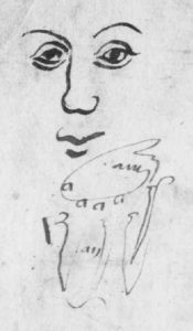 Un visage tracé sur un registre de Reillanne en 1597 (AD 1MI5/0443).