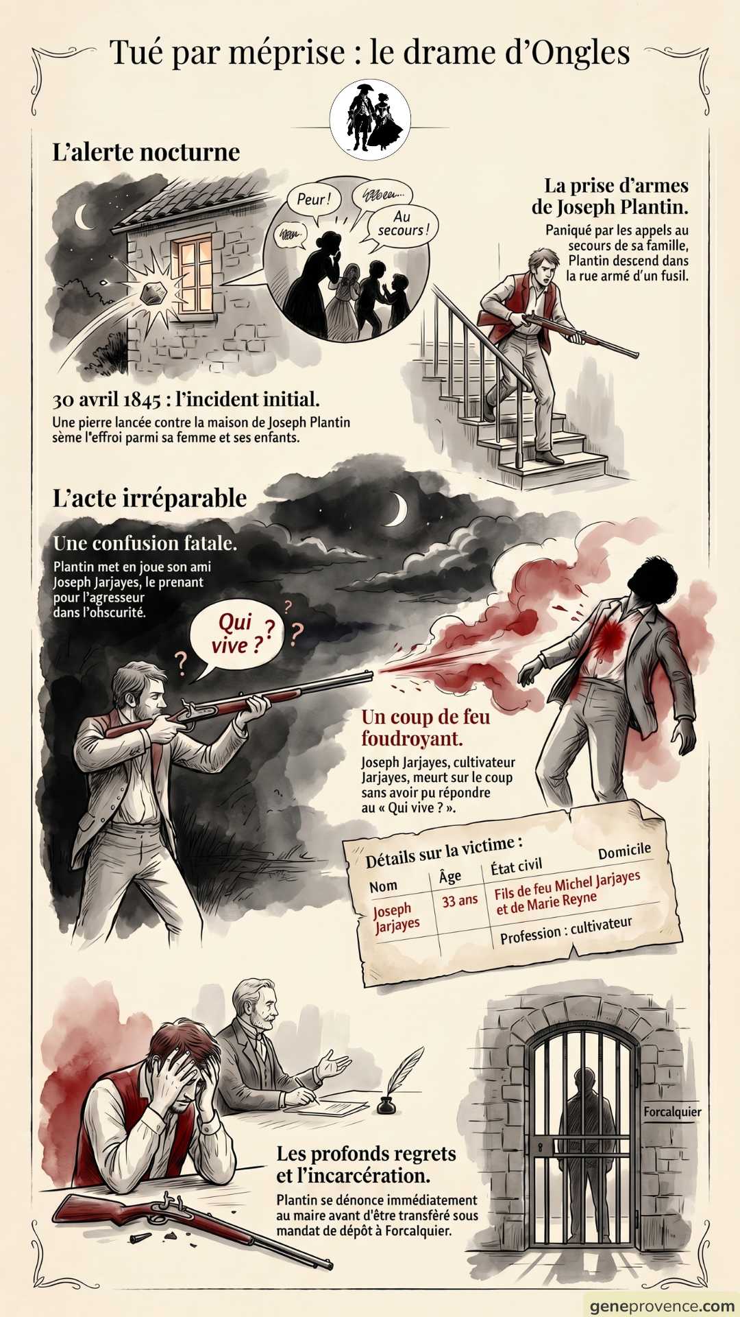 Joseph Plantin, un habitant d’Ongles (Alpes-de-Haute-Provence), était avec sa famille près de sa maison, ce 30 avril 1845, lorsqu’une pierre, lancée du dehors, vint tomber près de lui. Effrayés, sa femme et ses enfants appellent alors du secours. Quant à lui, il s’arme d’un fusil chargé de plomb et descend dans la rue.Un de ses voisins, son ami Joseph Jarjayes1 accourut. Plantin le prit pour l’agresseur et, croyant qu’il allait se précipiter sur lui, il le mit en joue en criant : « Qui vive ? »